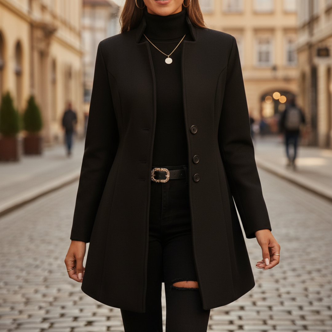Dieser Mantel ist eine passende Wahl für Kundinnen in der Schweiz, die ein elegantes und funktionales Kleidungsstück für den täglichen Gebrauch suchen.