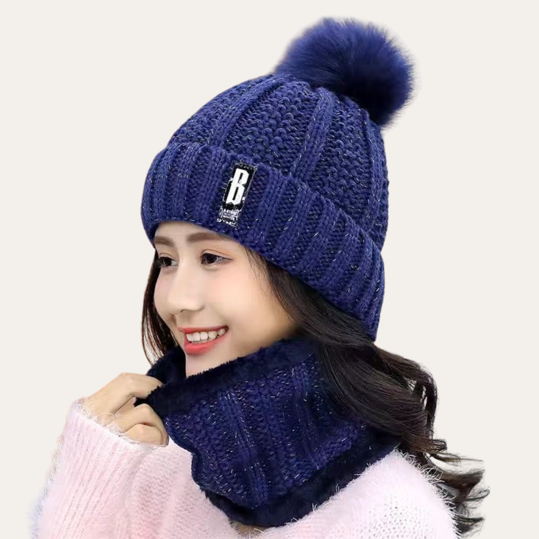 Damen Wintermütze mit Bommel und Strickschal Set | Vestea