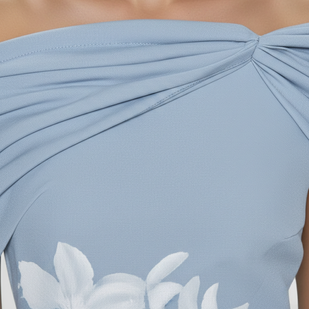 This womens midi dress is constructed from a smooth, light blue fabric featuring a white floral print throughout the skirt and bodice. The elegant garment features a unique off-the-shoulder neckline with draped fabric detailing and a fitted silhouette that flares slightly at the hem. Designed for formal or semi-formal occasions, it provides a sophisticated look with a functional, tailored fit.