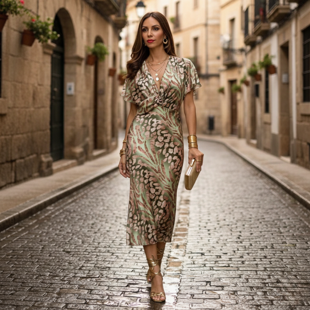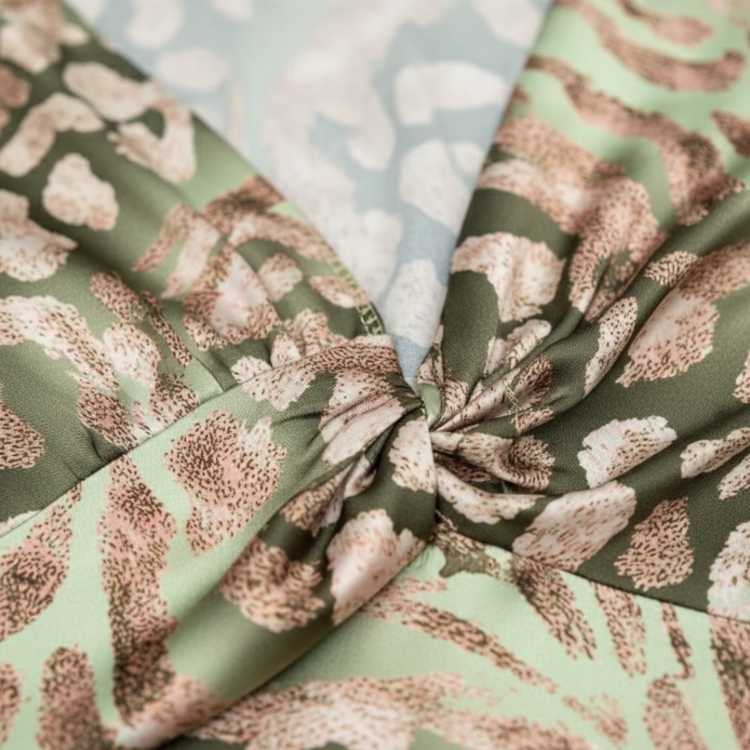 This womens midi dress is constructed from a smooth green satin fabric featuring an all-over abstract floral and leopard-inspired print in shades of brown and cream. The garment includes a plunging V-neckline with a twisted knot detail at the waist and short flutter sleeves, designed for a signature elegant and tailored silhouette at formal or social events.