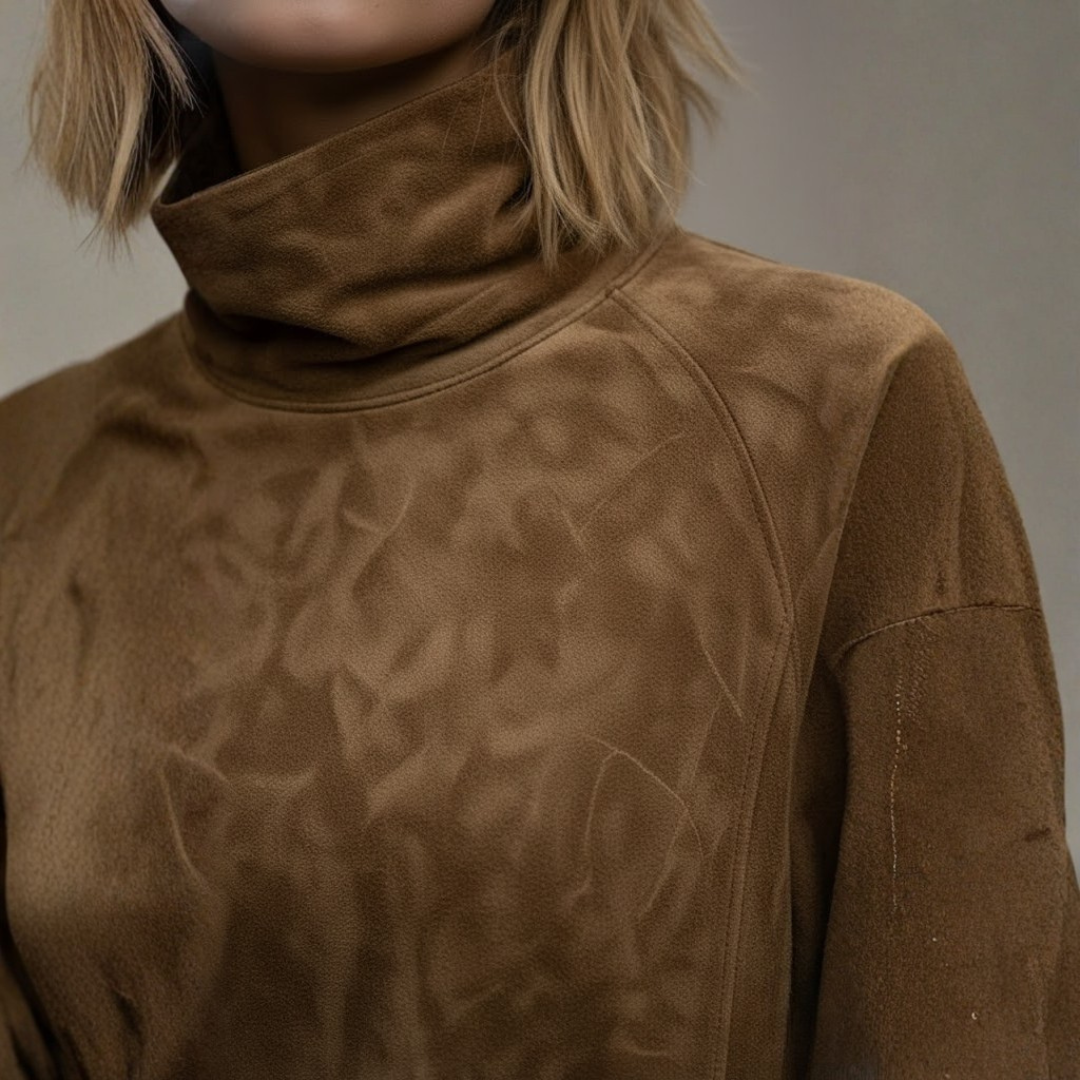 This women’s mini dress is made from a polyester-based faux suede fabric and designed with a high collar and long sleeves. It features a relaxed oversized fit and a mini-length silhouette, making it suitable for casual wear during autumn and winter.