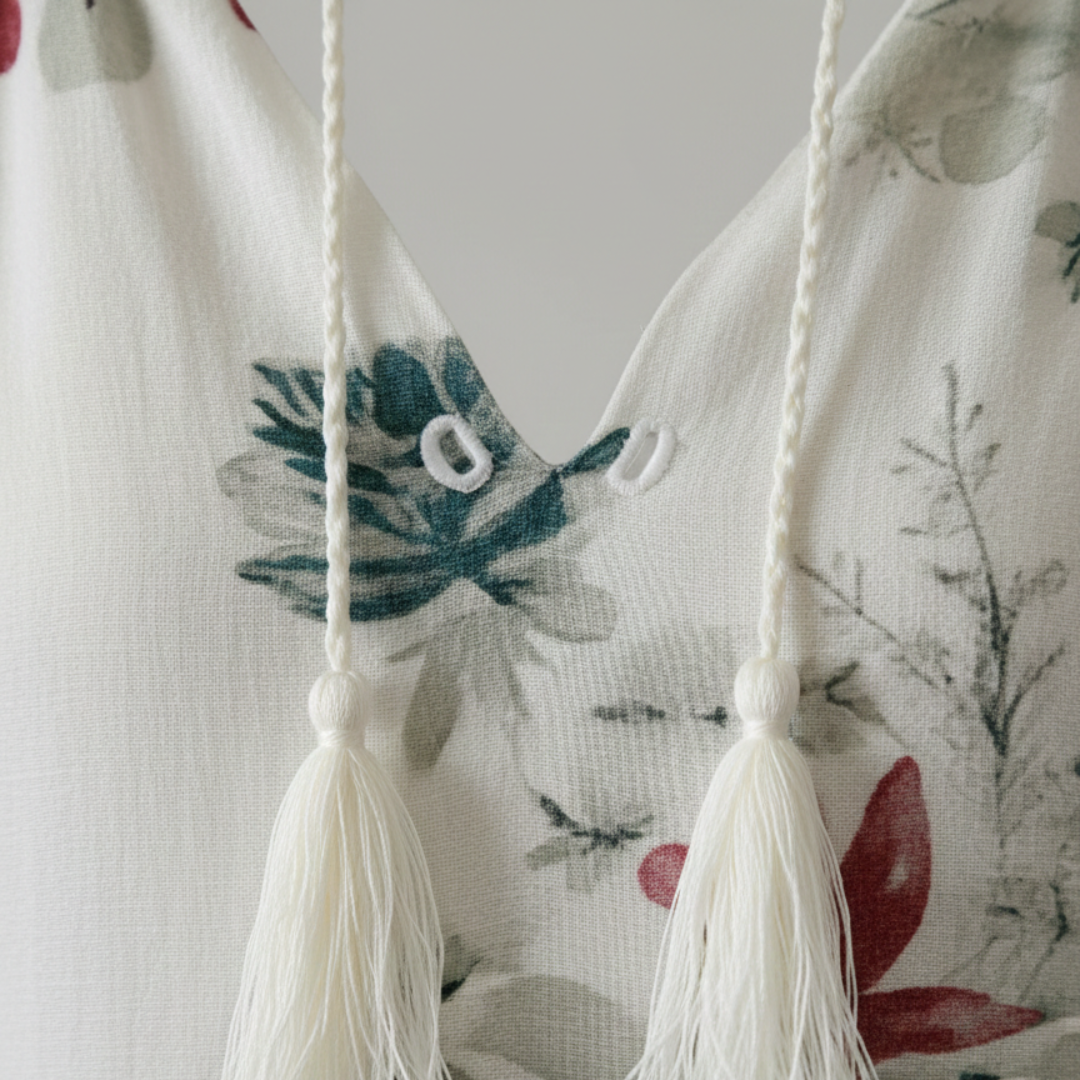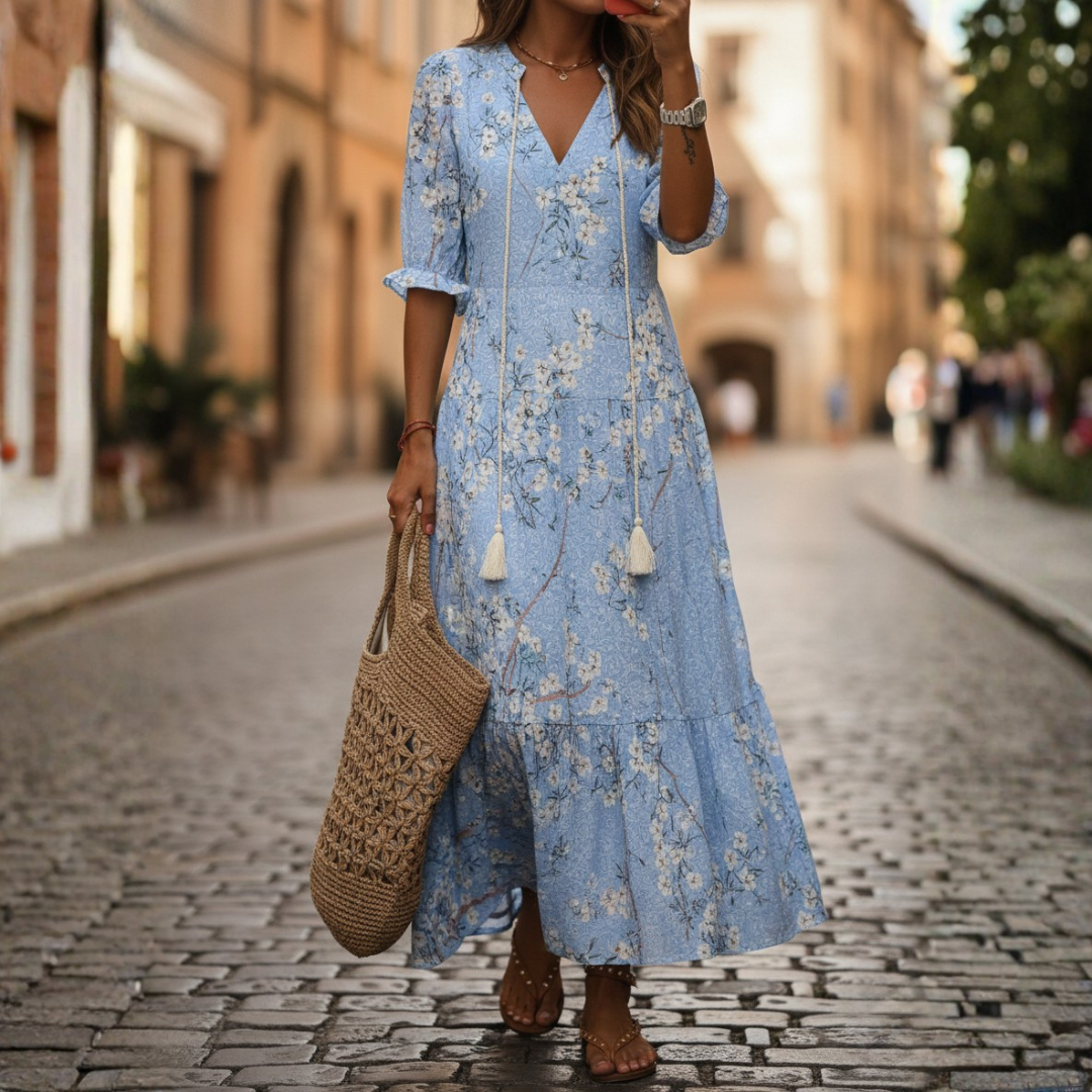This womens maxi dress is constructed from a lightweight blue and white fabric featuring an all-over bohemian geometric ikat-inspired print. The garment includes a V-neckline with decorative tassel ties, short flutter sleeves, and a tiered skirt that falls to a floor-length hemline. The high-waisted design is tailored to provide a figure-flattering silhouette while maintaining a relaxed, airy feel suitable for summer outings or beach gatherings.
