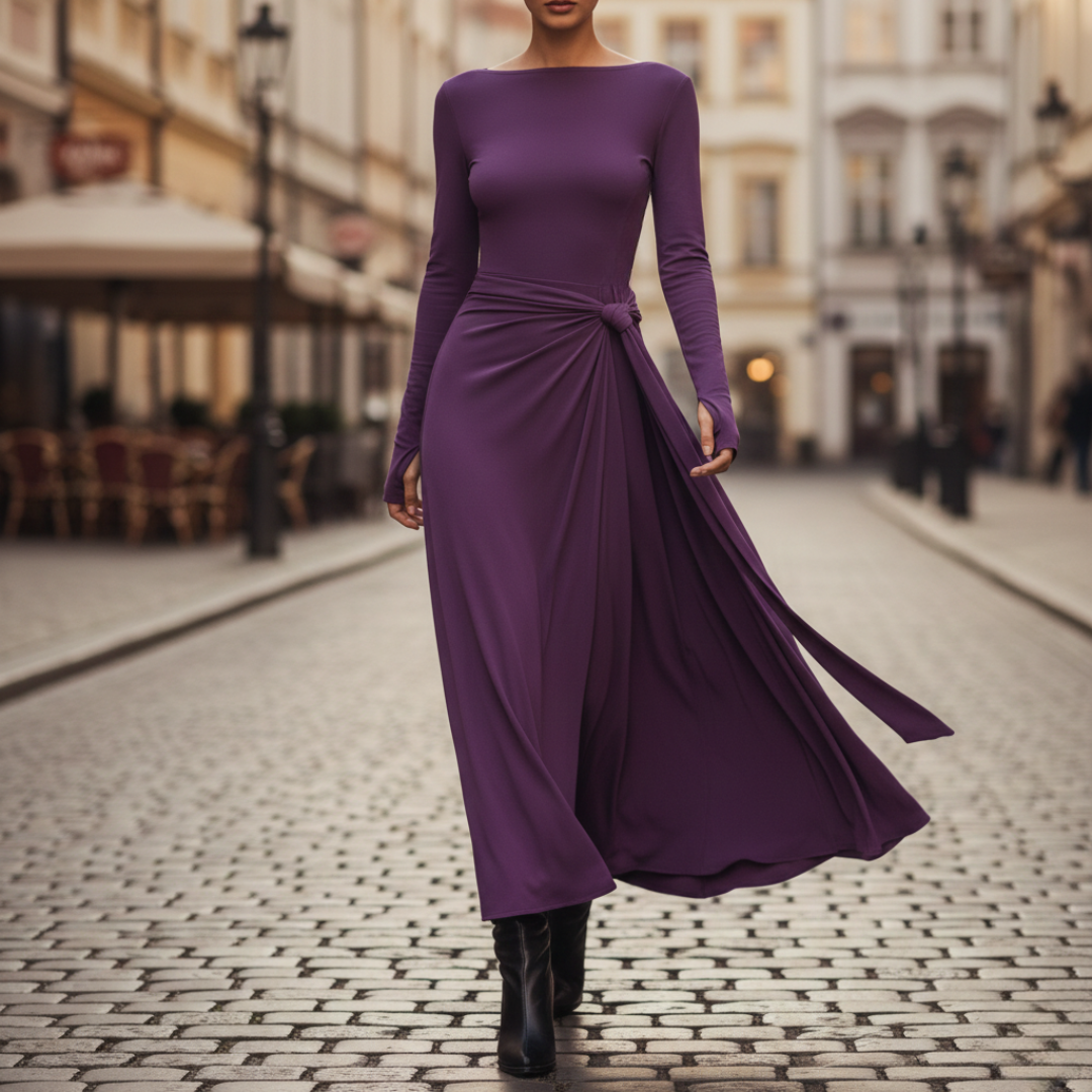 This women long sleeve maxi dress is constructed from a fabric featuring a side knot detail at the waist. It includes a crew neckline and sleeves with integrated thumbholes. The floor length skirt is designed with a side slit and a flared silhouette. This garment provides a slim fit through the torso and is intended for standard wear.