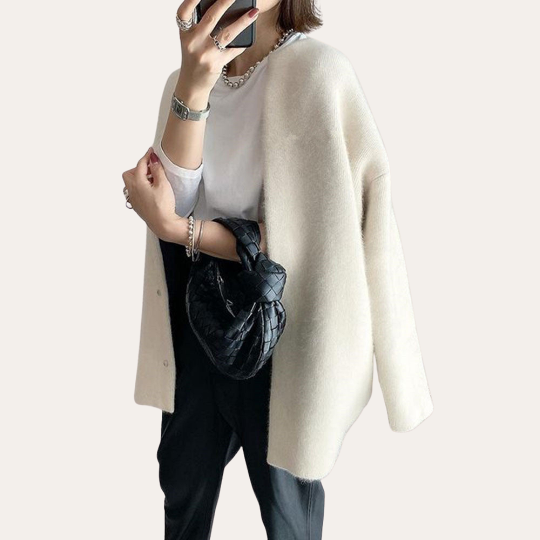 Die Strickjacke von Vestea vereint Komfort und Stil in einem minimalistischen Design. Perfekt geeignet für modebewusste Frauen, die Wert auf schlichte Eleganz und hochwertige Verarbeitung legen.