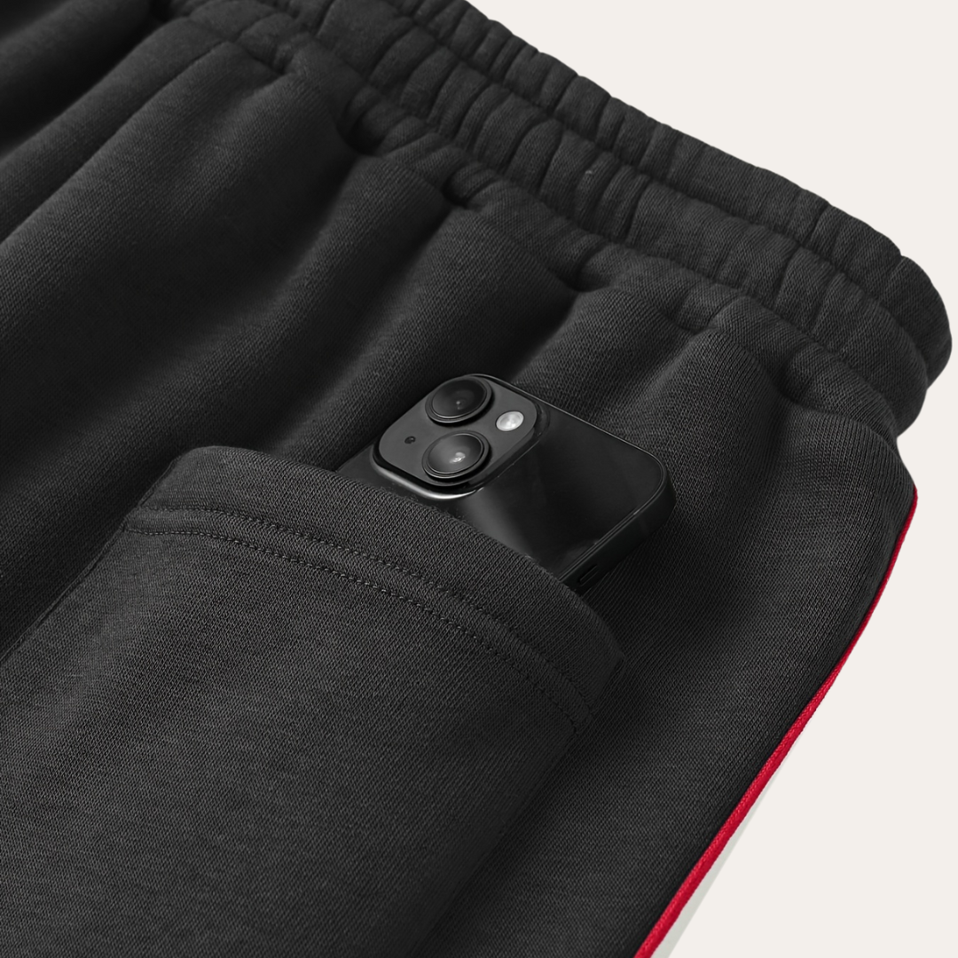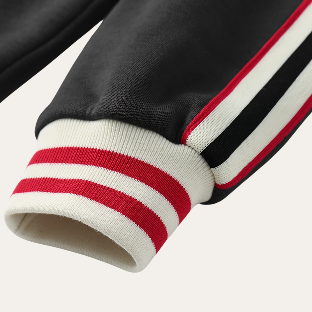 Modisches Design: Schwarzer Trainingsanzug mit stilvollen weißen und roten Streifen für einen sportlichen Look